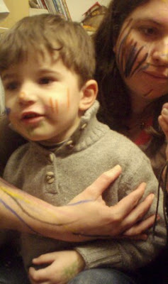 Il nous arrive aussi de jouer les enfants du peuple Omo, avec beaucoup moins de talent. Il me maquille les bras, le visage et les mains, pendant que je le décore. Et après direction le bain, le savon et l'huile végétale (rien de mieux pour enlever le gras du maquillage).